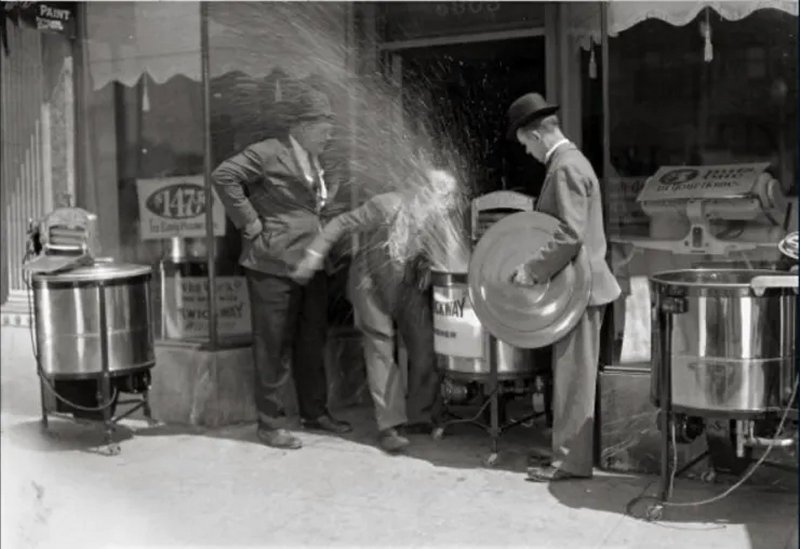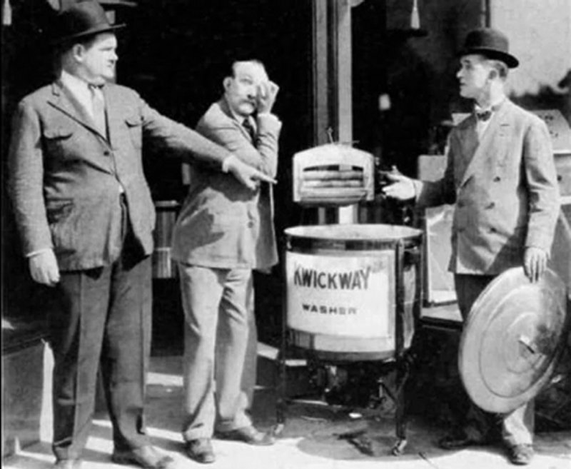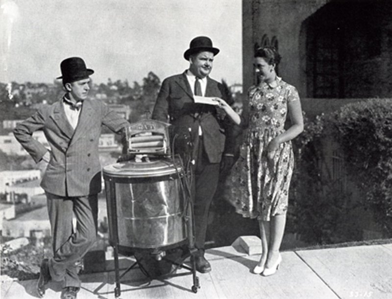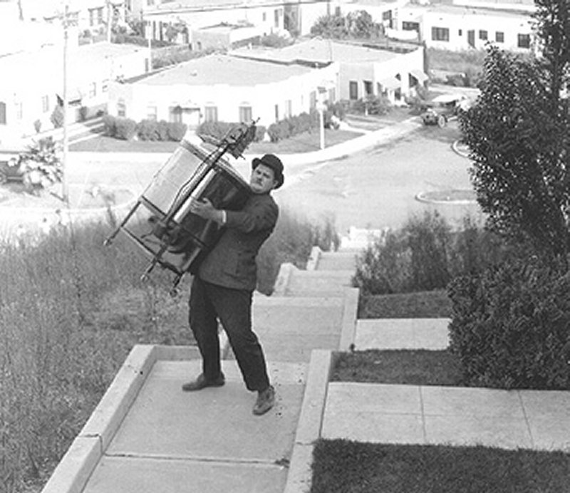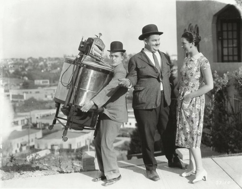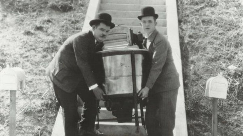 Laurel & Hardy entregan una voluminosa lavadora a una casa frente a un enorme tramo de escaleras...