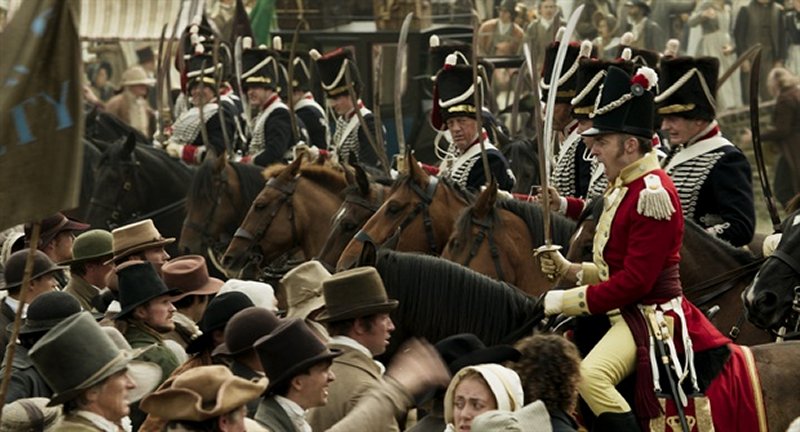 Los húsares llegan y Hulton le grita al coronel L’Estrange que haga algo, que disperse a la multitud y que el público está atacando a la caballería. Los militares, algunos a caballo, otros a pie y armados con rifles, se alinean para comenzar a alejar a la multitud de la salida y dirigirse hacia el centro de la explanada. El público corre a través de cualquier brecha que pueda encontrar entre los húsares, algunos son atacados y golpeados mientras lo hacen, pero no hay otro lugar al que puedan ir. Los húsares comienzan a atacar al público con sus espadas, derriban a una mujer y a su bebé y luego pisotean al bebé con sus caballos. La masacre realmente ha comenzado.
