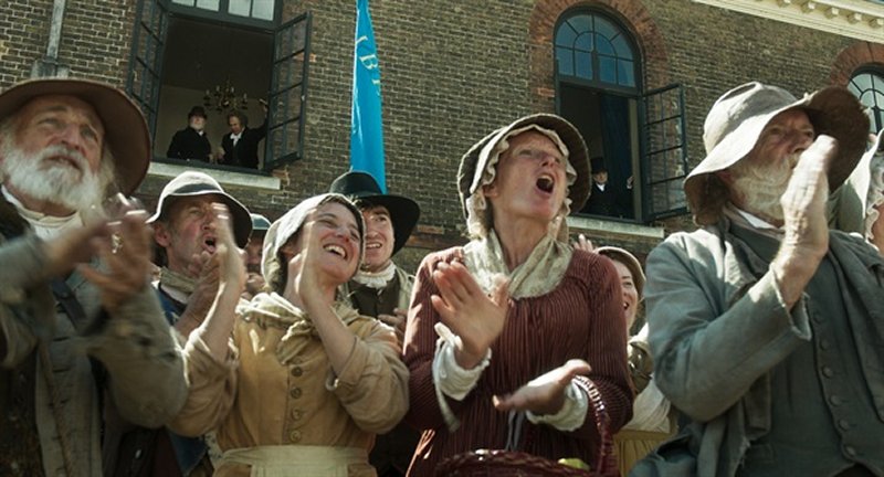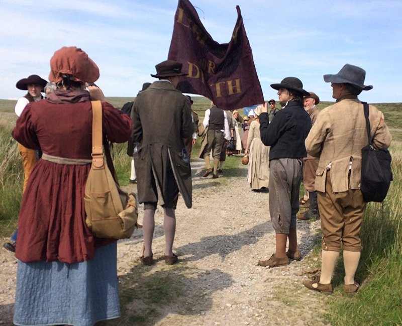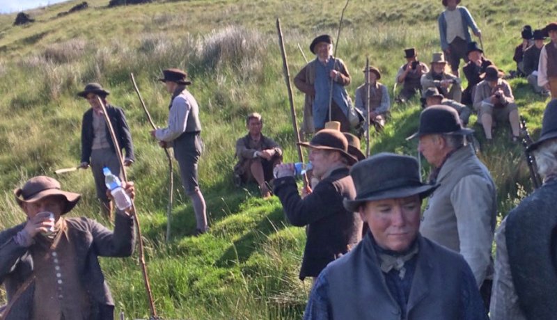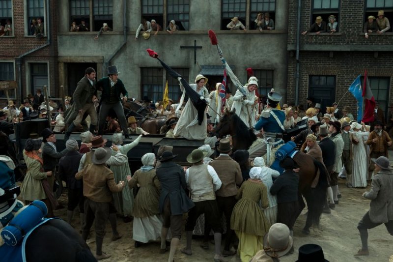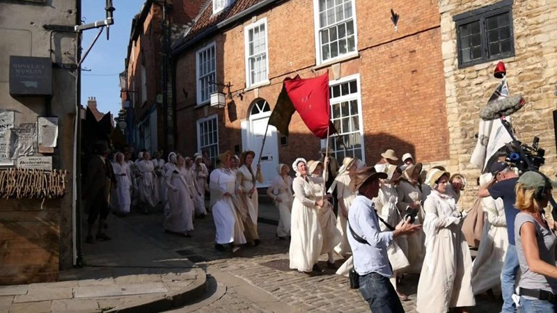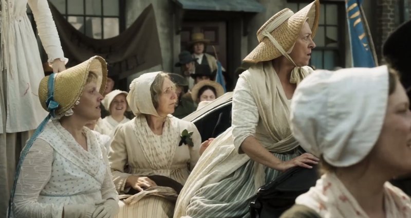 La familia de Nellie, incluidos los jóvenes George y Sarah, parten para la reunión. Vemos a sus vecinos unirse a la marea de personas, todas vestidas con su mejor ropa, camino a St Peter’s Field.