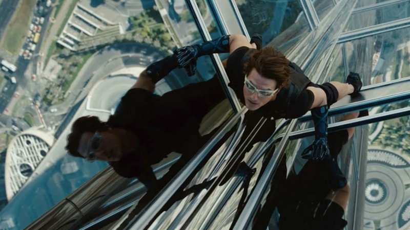 El equipo tuvo acceso al piso 123 del edificio, que aún estaba inacabado, y pudieron meter los aparejos de las cámaras, grúas y otra maquinaria necesaria para filmar los movimientos de Cruise por el exterior del edificio. Para poder acceder al exterior del edificio, se quitaron entre 15 y 20 ventanas de la fachada en diferentes pisos, y a través de ahí se podían sacar hacia afuera los aparejos y brazos articulados. Se decidió que, durante el día, el cristal exterior del edificio se calentaba tanto que resultaba imposible trabajar a plena luz del sol. “No se podía ni tocar el cristal”, recuerda Smrz. El equipo encontró una zona (que casualmente estaba situada justo encima de uno de los miradores públicos del edificio) fuera del alcance directo del sol donde Smrz pudo colocar los aparejos para los especialistas y donde además el director de fotografía, Robert Elswit, podía iluminar adecuadamente para la fotografía principal. “Cuando llegamos al plató, lo habíamos ensayado tanto, que parecía como si hubiéramos estado allí 100 veces”, explica Smrz.