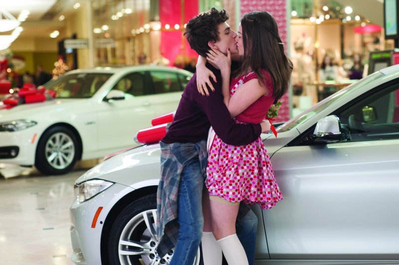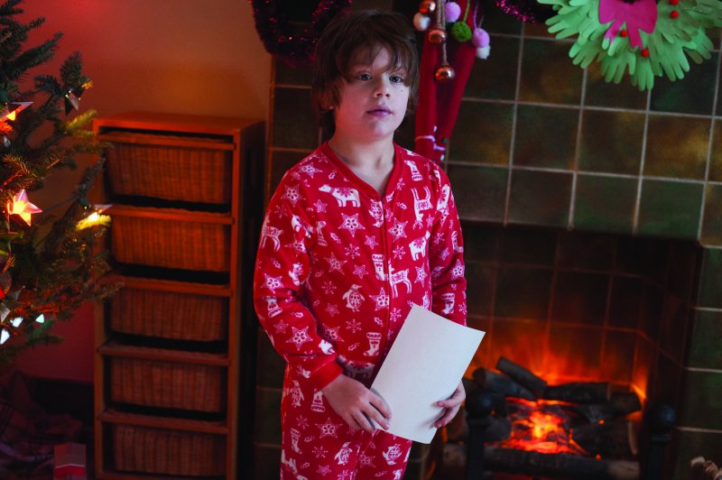 Nelson le dio varias fotos de la paleta de colores para las escenas de interior y de exteriores. “Para los exteriores era una paleta poco saturada, de grises y blancos sobre todo, y en el paisaje destacaba el abrigo rojo de Santa Claus,” dice. “Se trataba de establecer una estética que partiera de una premisa invernal, este ambiente pálido de sentirte fuera en el frío… pero también de estar bajo presión, en este día tan especial del año, cuando se siente la presión. Les obliga a lidiar consigo mismos en todas partes, ya sea en el coche, en el aeropuerto, el centro comercial, la cafetería o en casa.”