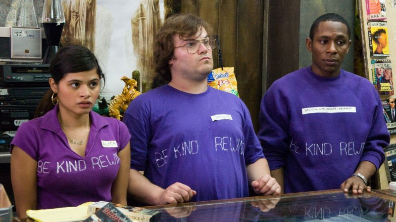 Rebobine, por favor comienza con un accidente de Jerry, cuando intentaba sabotear la planta de energía, a la cual le atribuía sus jaquecas. La consecuencia es que no sólo no cumple con su objetivo, sino que su cuerpo se magnetiza y causa que todas las cintas del viejo videoclub en donde Mike trabaja se borren. Como una iniciativa entre torpe y divertida para ellos, deciden hacer su propia remake de cada película, para no perder clientela. Pero lo que había sido empezado como un juego, terminó siendo serio cuando quedaron asombrados por el éxito de estas versiones bizarras. Desde ese momento, no sólo ellos participan de esta empresa, sino que todo el vecindario comienza a colaborar en clásicos como King Kong, Robocop o Paseando a Miss Daisy...
