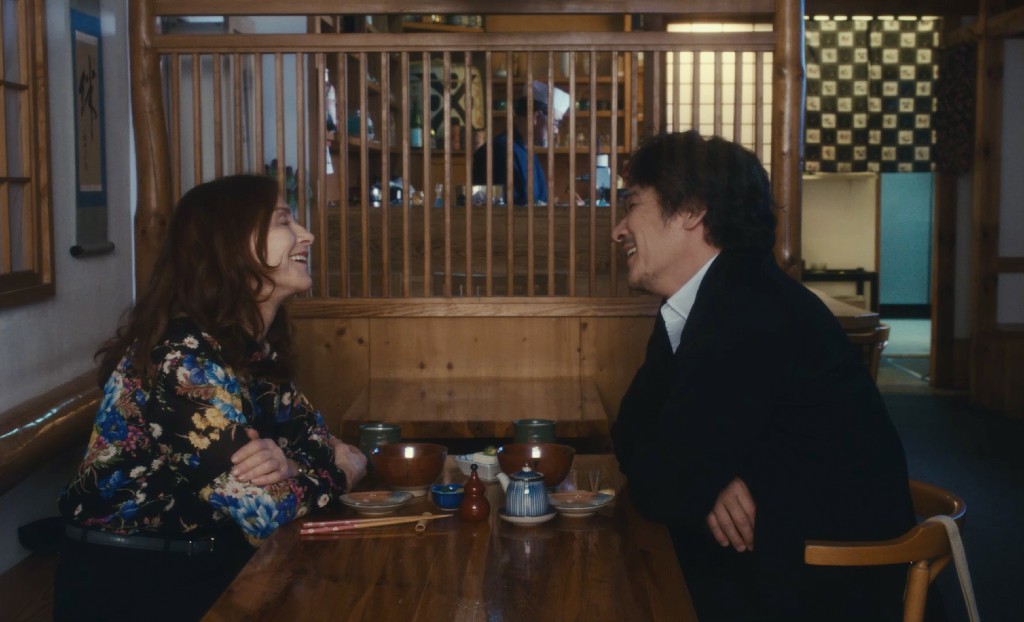 En casi todas las escenas con Antoine, usamos una pantalla verde. Por lo tanto, en muchas escenas Isabelle Huppert estaba sola frente a la cámara. ¡Y yo era quien interpretaba a Antoine fuera de la pantalla! Estaba muy contenta de usar las pantallas verdes, porque nos permitieron hacer algunas cosas un poco inusuales que de otro modo habrían sido imposibles. Por ejemplo, cuando Sidonie y Kenzo están juntos en un taxi en la isla de Naoshima, se puede ver el mismo panorama idéntico en ambos lados del vehículo. El Japón representado en mi película es muy diferente del tipo de Japón que se ve habitualmente en el cine, donde todo es frenético, ruidoso y extraño...