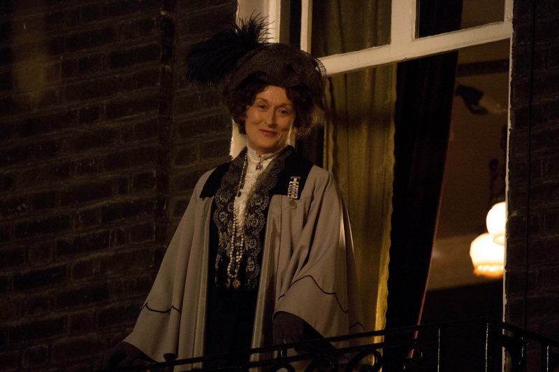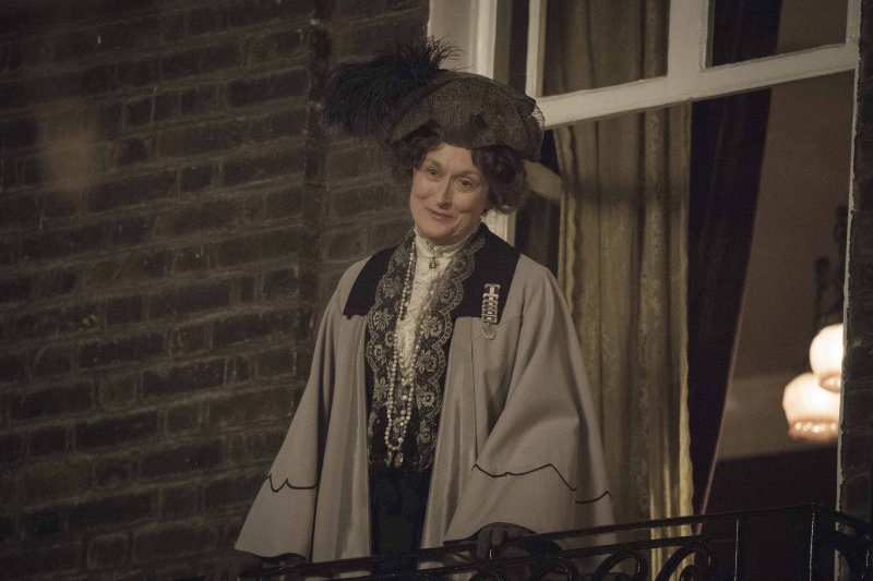 El look de Edith contrasta con el estilo eduardiano y más rígido de Meryl Streep, en el papel de Emmeline Pankhurst. «Pankhurst tiene un estilo muy eduardiano, pero también influenciado por el movimiento Arts and Crafts», explica Petrie. «Hay muchos adornos bordados, ¡siempre lleva algo colgando! Por supuesto, tuve que limitar todos esos elementos hasta cierto punto, porque no quería que desviaran la atención de su discurso. Buscábamos feminidad y suavidad, así que nos centramos en su silueta, en las grandes mangas que llevaba. Todo eso lo habíamos visto en el material de referencia, aunque lo atenuamos un poco.»