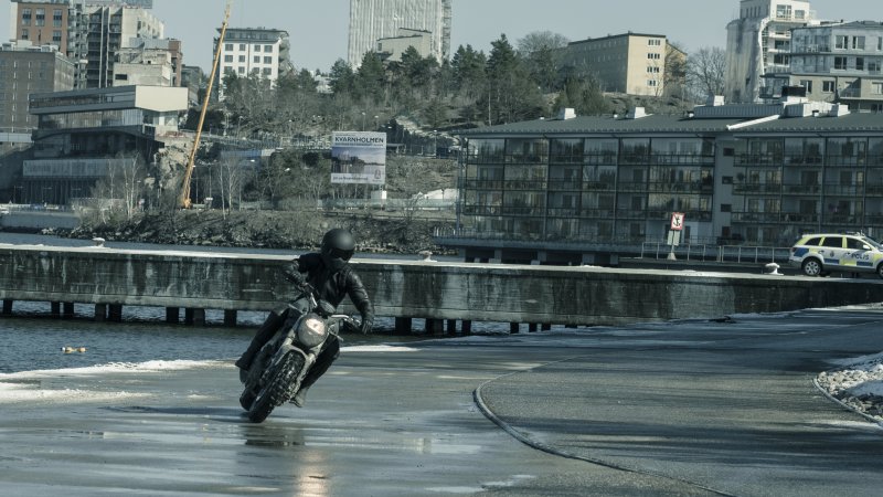 De igual modo, una serie de escenas arriesgadas de persecuciones de coche se hicieron de maneras particulares. “En una escena, el reto era que estábamos en un lugar muy estrecho en invierno, así que había nieve y zonas húmedas”, recuerda Hotz. “Los coches se manejan de forma completamente distinta en este entorno que en un lugar seco. Y queríamos rodar todo lo posible con la actriz y meternos entre el tráfico normal. Lo que hicimos fue poner a un ‘conductor superior’; es un coche plenamente operativo, pero el que lo maneja se sienta encima de él, mientras que el actor se pone al volante y finge que conduce”.