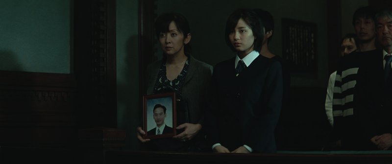 Ensayamos con Fukuyama y Yakusho antes de empezar a rodar. La escena en la cárcel es maravillosa. Al principio me pareció que no debía incluir muchas escenas en la sala de entrevistas de la cárcel porque serían muy estáticas. En todos los dramas familiares que he rodado, siempre he reflexionado en cómo colocar y mover a los personajes en el decorado. Pero esta sala contenía dos espacios claramente divididos con personas sentadas en cada uno, no ofrecía más posibilidades. Cuando pensé en los dos, uno frente al otro, entendí que podían ser escenas cargadas de emoción y decidí añadir más secuencias en la sala de entrevistas. Después de ver juntos a los actores, todo se aclaró.