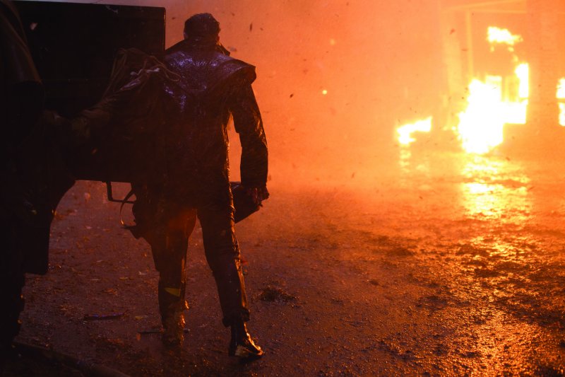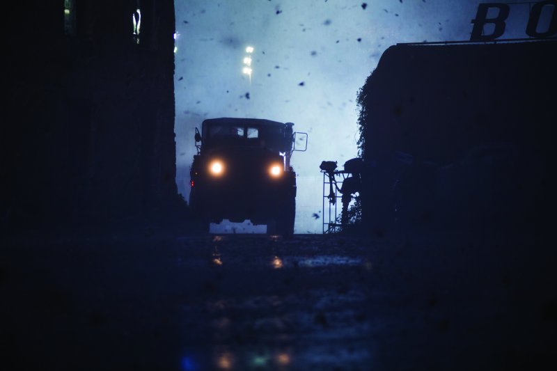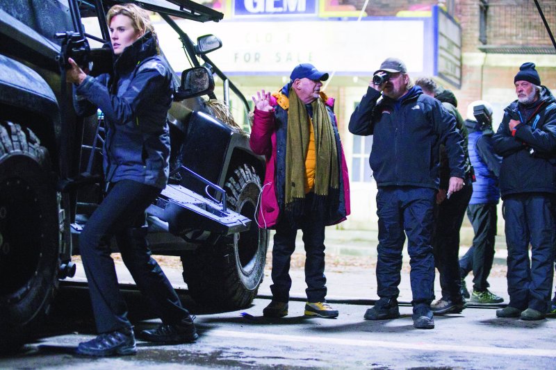 Maggie Grace está de acuerdo con él. “Realmente quita la actuación de en medio, ¿sabes lo que quiero decir? Durante gran parte de esta película, como aquí en Manchester, ha habido algo más de trabajo en escenas. Pero la mayor parte de los tres meses en Bulgaria, nuestro trabajo consistía en estar presentes e intentar superar los obstáculos que teníamos delante. Como actriz, es un reto bastante guay, diferente.” Se acuerda del primer día del rodaje, en agosto de 2016. “Era la escena que tiene lugar fuera de la comisaría. Y pusieron ventiladores que creaban un viendo de 160 kilómetros por hora junto con la lluvia, y se rompieron los cristales de lo fuerte que era el viento. La primera vez que encendieron esos ventiladores, los árboles que estaban en macetas se volcaron y a mí me tiró al suelo. ¡No me lo esperaba! Esperaba algo de viento pero fue…” No encuentra las palabras. “Toby y yo nos miramos al acabar el rodaje de ese día, después de 16 horas, y nos decíamos “Dios mío, ¿qué está pasando?’ Era agosto, ¿cómo sería noviembre en Bulgaria?” Elli, la doble de acción que filmó las escenas de acción de mayor riesgo de Grace, estaba acostumbrada a condiciones meteorológicas adversas en su carrera. Pero, ¿y Casey Corbyn? “Tengo tantos moratones que parezco un dálmata,” dice Grace. “¡Estoy completamente cubierta de moratones!”